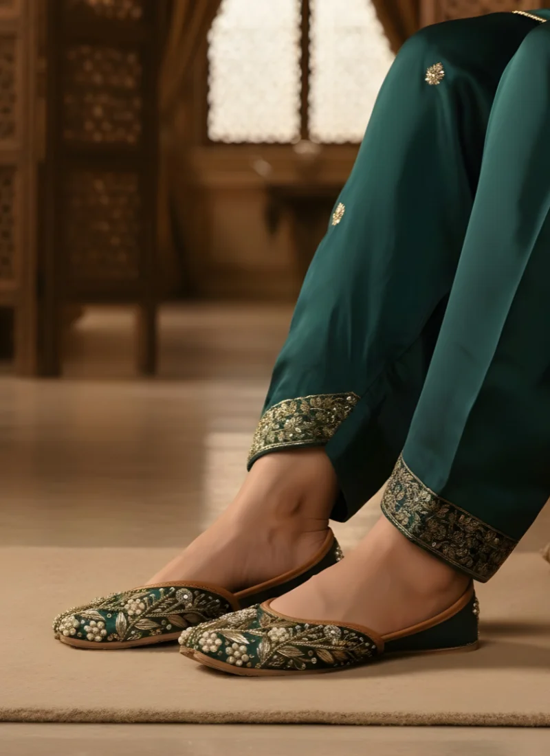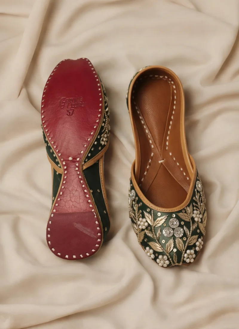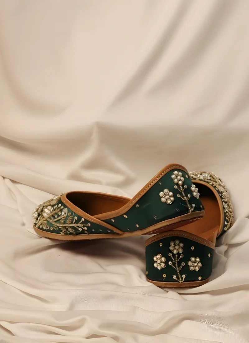 Celebrate timeless Punjabi craftsmanship with these elegant Phulkari-inspired jutties. Handcrafted with intricate floral embroidery and pearl accents, they blend tradition with modern comfort—perfect for weddings, festive wear, and ethnic outfits.